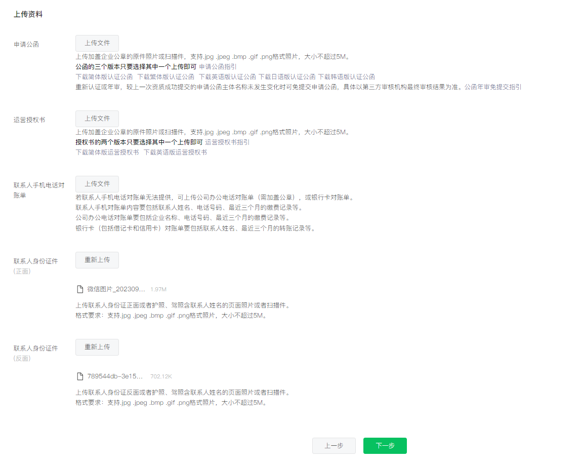 5.上传申请公函、运营授权书、联系人手机电话对账单、联系人身份证件正反面,点击提交